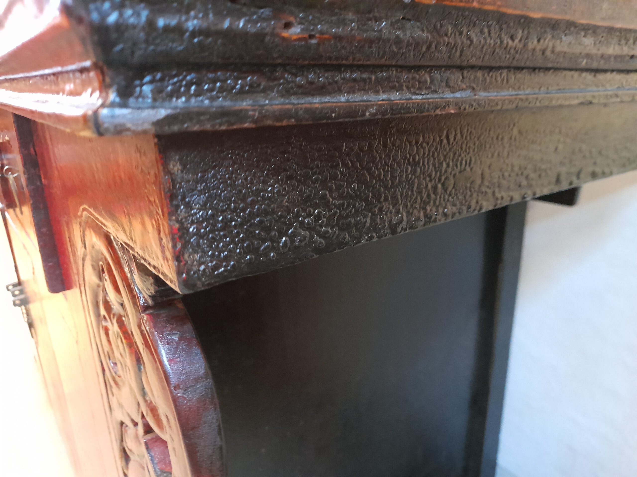 Bei diesem antiken Sideboard spielt der Lichteinfall und Betrachtungswinkel eine Rolle : entweder domieren rote Farbtöne, oder der Schwarz-Anteil wird deutlicher.                              Rundum vollmassiver Korpus mit gezapften Verbindungen nach alter Schule.