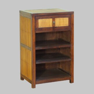 Der offene Regalbereich oben verteilt sich auf vier Fächer mit den lichten Innenhöhen 38 cm / 33 cm / 33cm / 33 cm . Dessen Seiten sind von runden Stäben aus Teakholz eingefasst, so daß keine Gegenstände herausfallen können, das Regal aber trotzdem noch schön luftig erscheint.