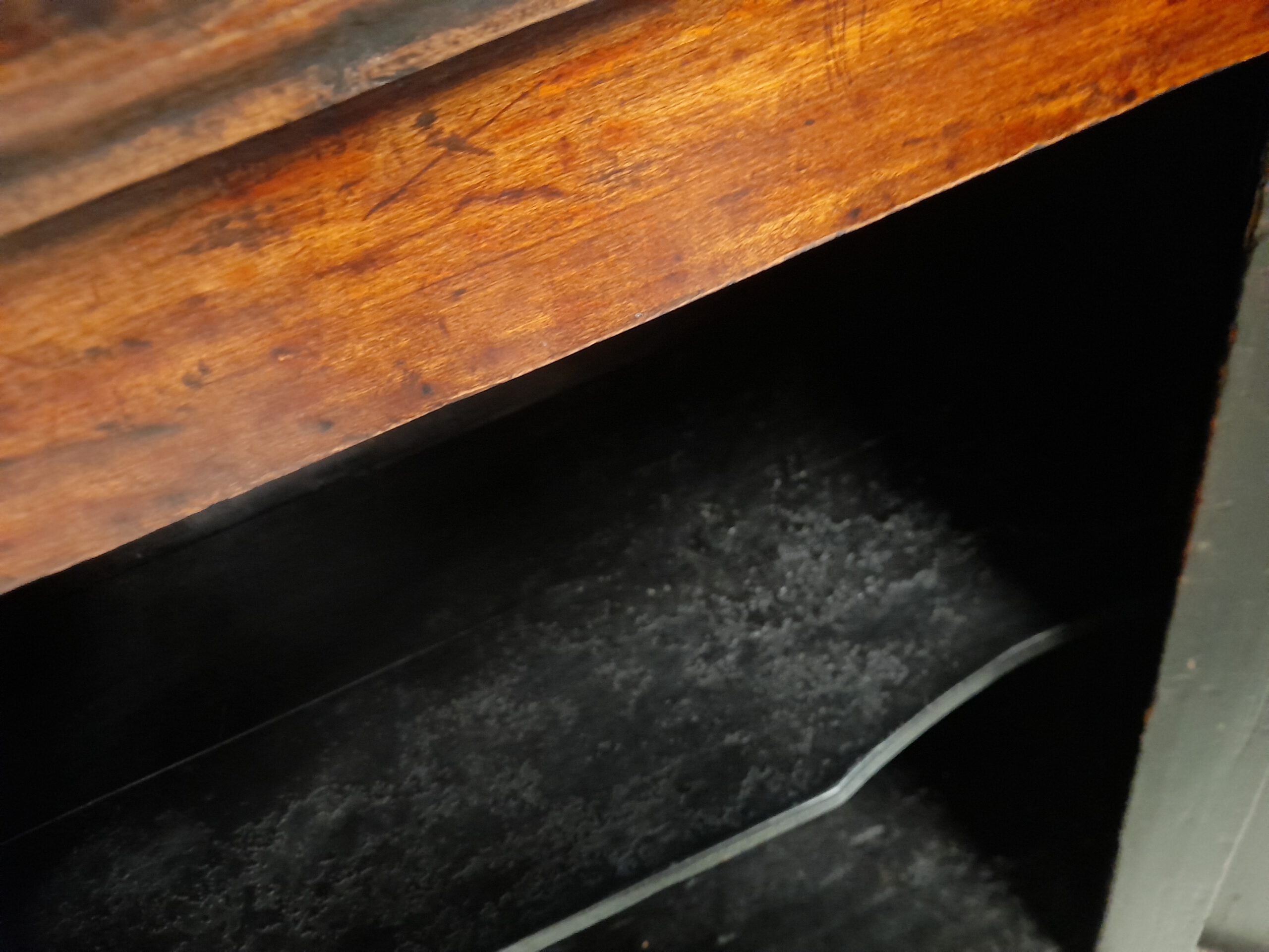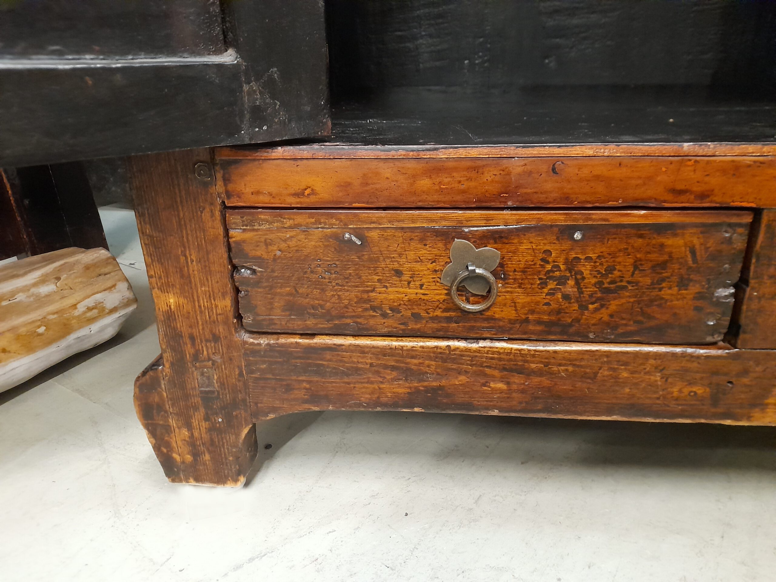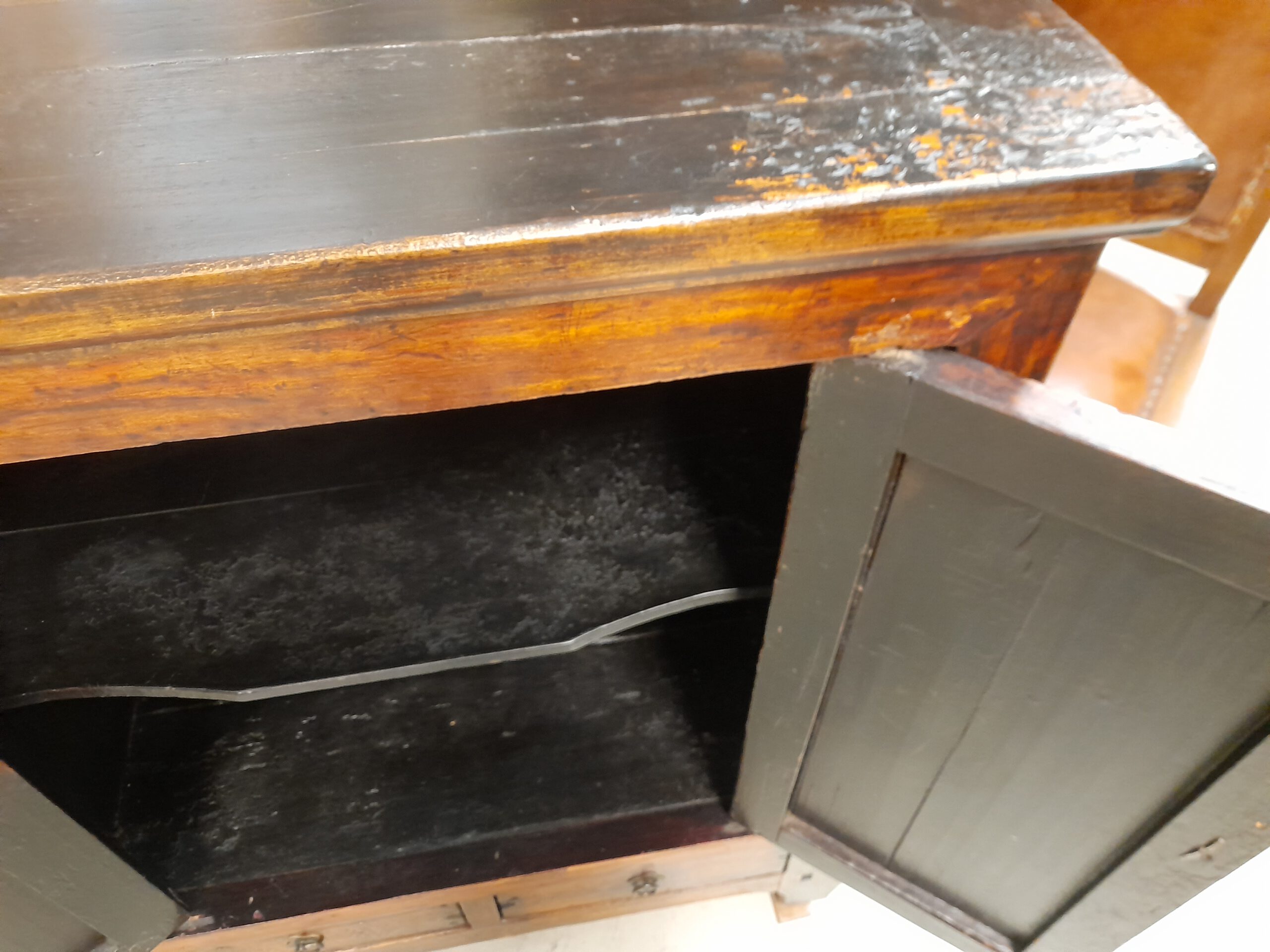 Fantastische Patina, erdiges Braunschwarz, zwei Türen, zwei Schübe.
